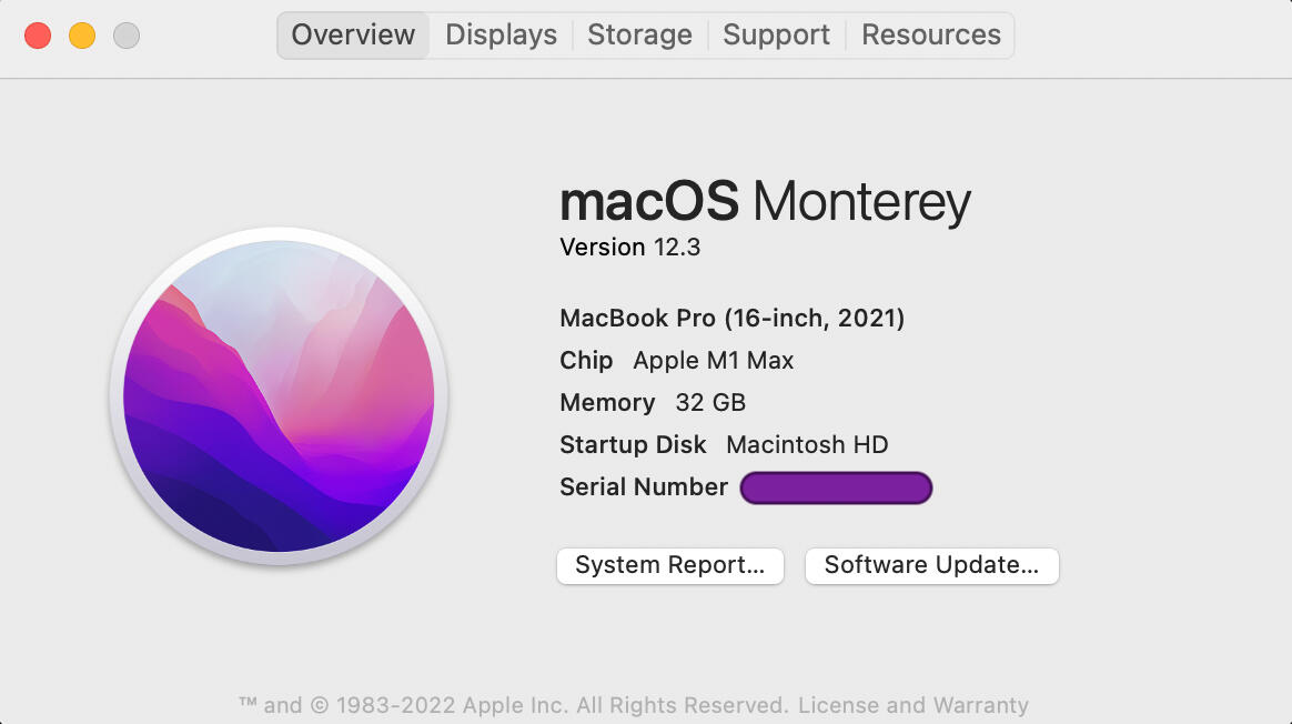 Mac Specs - Macbook Pro 16" M1 Max; 10-core CPU, 32-core GPU; 32GB Unified Memory